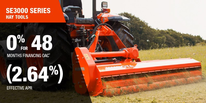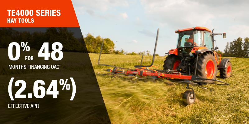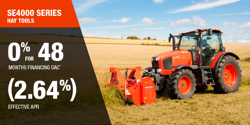 *For all offers: Prices and payments include freight and other applicable fees (including environmental fees, administration fees, set-up fees, and dealer fees). Taxes, delivery fees, insurance and registration are extra. Dealer may sell for less. Dealer order/trade may be necessary (but may not be available in all cases). Some restrictions apply. Offers valid only at participating dealers in Canada and are subject to change, cancellation or extension at any time without notice or obligation. Minimum down payment of 10% required for financing offers on turf and agricultural products. Specifications, features, illustrations and equipment shown are based on the latest available information at the time of publication. Some models are shown with optional accessories available at extra cost. Although descriptions are believed to be correct, accuracy cannot be guaranteed. We reserve the right to make changes at any time, without notice or obligation to specifications, accessories, materials, models, prices, payments and other information. Offer valid until January 12, 2026. See your participating Kubota dealer or visit www.kubota.ca for complete details.