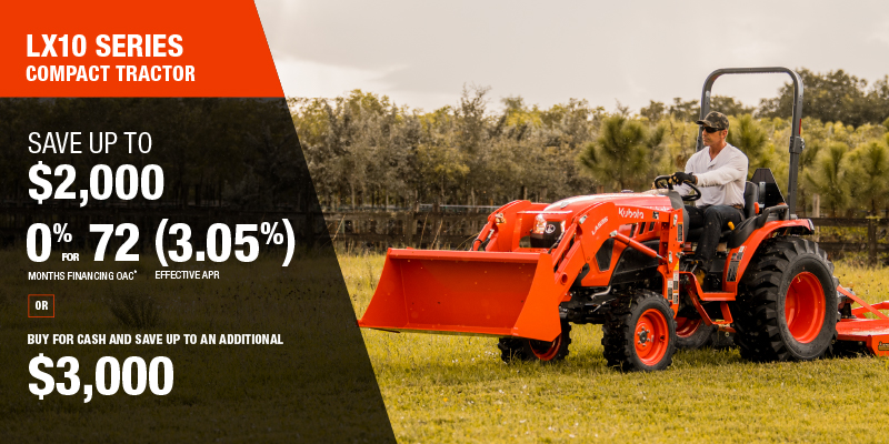 Rebate of $2,000 available on cash purchases of a new LX2610/L3310 Rops only.  Rebate of $3,000 available on cash purchases of a new LX10 Cab only.   Offer valid until 01-12-2026."