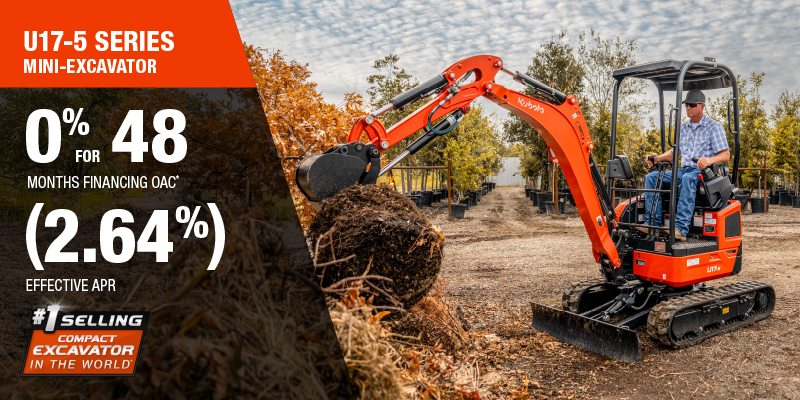 Representative finance example for the U17-5: $50,446.13 financed at 0% (2.64% effective APR which factors in $2,360.88 in non stackable cash that cannot be combined with finance offers) equals $945.86 monthly for 48 months. $5,044.61 down payment required. Cost of borrowing is $2,360.88 for a total obligation of $50,446.13. Financing available on approved credit. Prices and payments include freight and other applicable fees (including environmental fees, administration fees, set-up fees, and dealer fees on the model specified). Excavator Claim: "Kubota is the world’s #1 selling compact excavator for 20 years."  Disclaimer: According to 2023 data from Off-Highway Research including all Kubota Group brand sales. Offer valid until 01-12-2026.