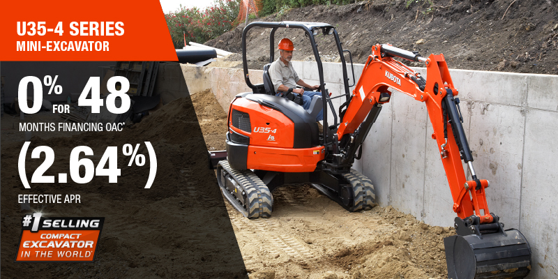 Representative finance example for the U35-4: $85,546.39 financed at 0% (2.64% effective APR which factors in $4,003.57 in non stackable cash that cannot be combined with finance offers) equals $1603.99 monthly for 48 months. $8,554.64 down payment required. Cost of borrowing is $4,003.57 for a total obligation of $85,546.39. Financing available on approved credit. Prices and payments include freight and other applicable fees (including environmental fees, administration fees, set-up fees, and dealer fees on the model specified). Excavator Claim: "Kubota is the world’s #1 selling compact excavator for 20 years."  Disclaimer: According to 2023 data from Off-Highway Research including all Kubota Group brand sales. Offer valid until 01-12-2026.