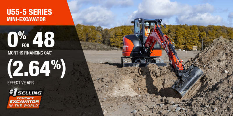 Representative finance example for the U55-5: $122,059.55 financed at 0% (2.64% effective APR which factors in $5,712.39 in non stackable cash that cannot be combined with finance offers) equals $2288.62 monthly for 48 months. $12,205.96 down payment required. Cost of borrowing is $5,712.39 for a total obligation of $122,059.55. Financing available on approved credit. Prices and payments include freight and other applicable fees (including environmental fees, administration fees, set-up fees, and dealer fees on the model specified). Excavator Claim: "Kubota is the world’s #1 selling compact excavator for 20 years."  Disclaimer: According to 2023 data from Off-Highway Research including all Kubota Group brand sales. Offer valid until 01-12-2026.